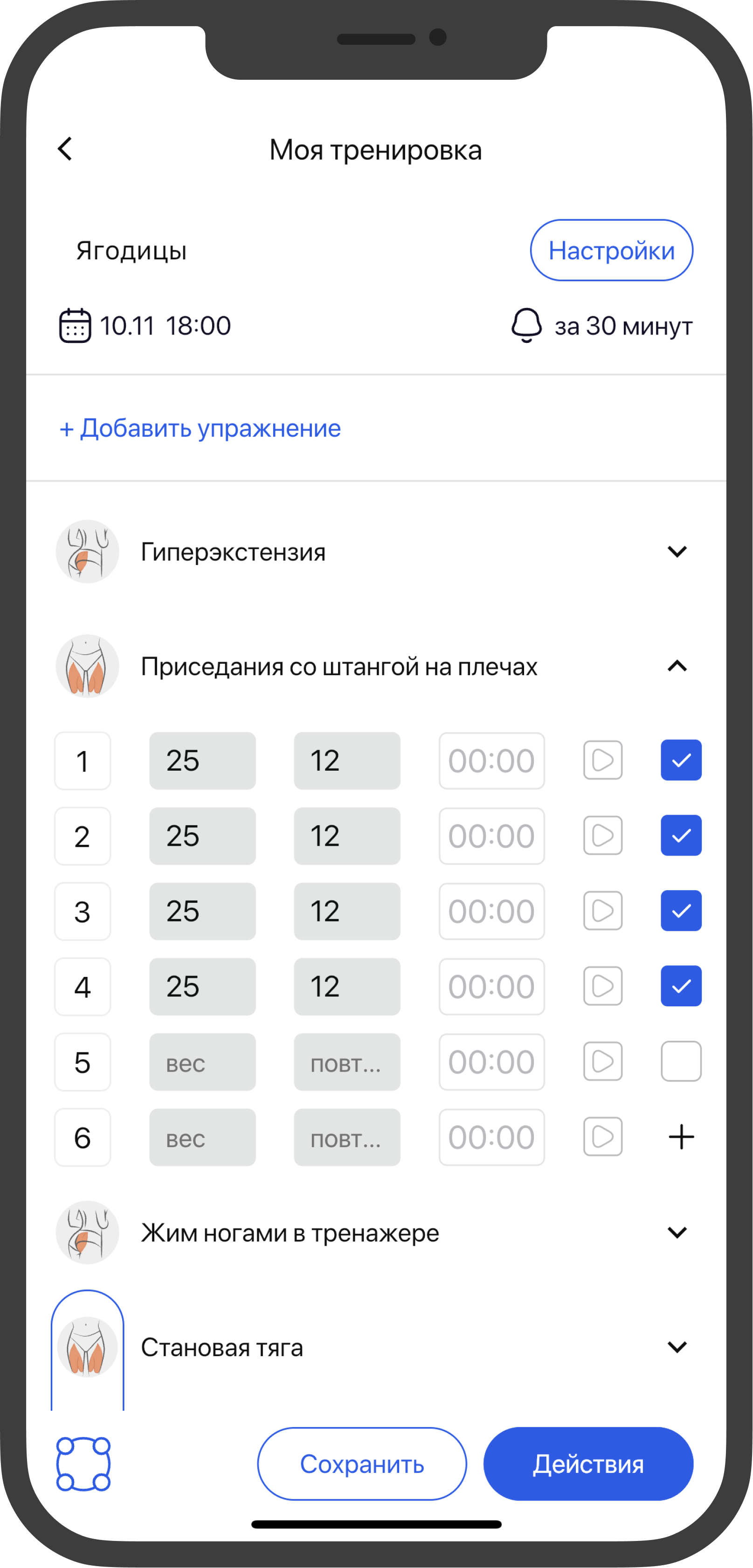 Готовьтесь к эффективным тренировкам заранее — продумайте свою нагрузку, запланируйте количество подходов и повторений, вес, создайте суперсеты, добавьте кардио и разминку.